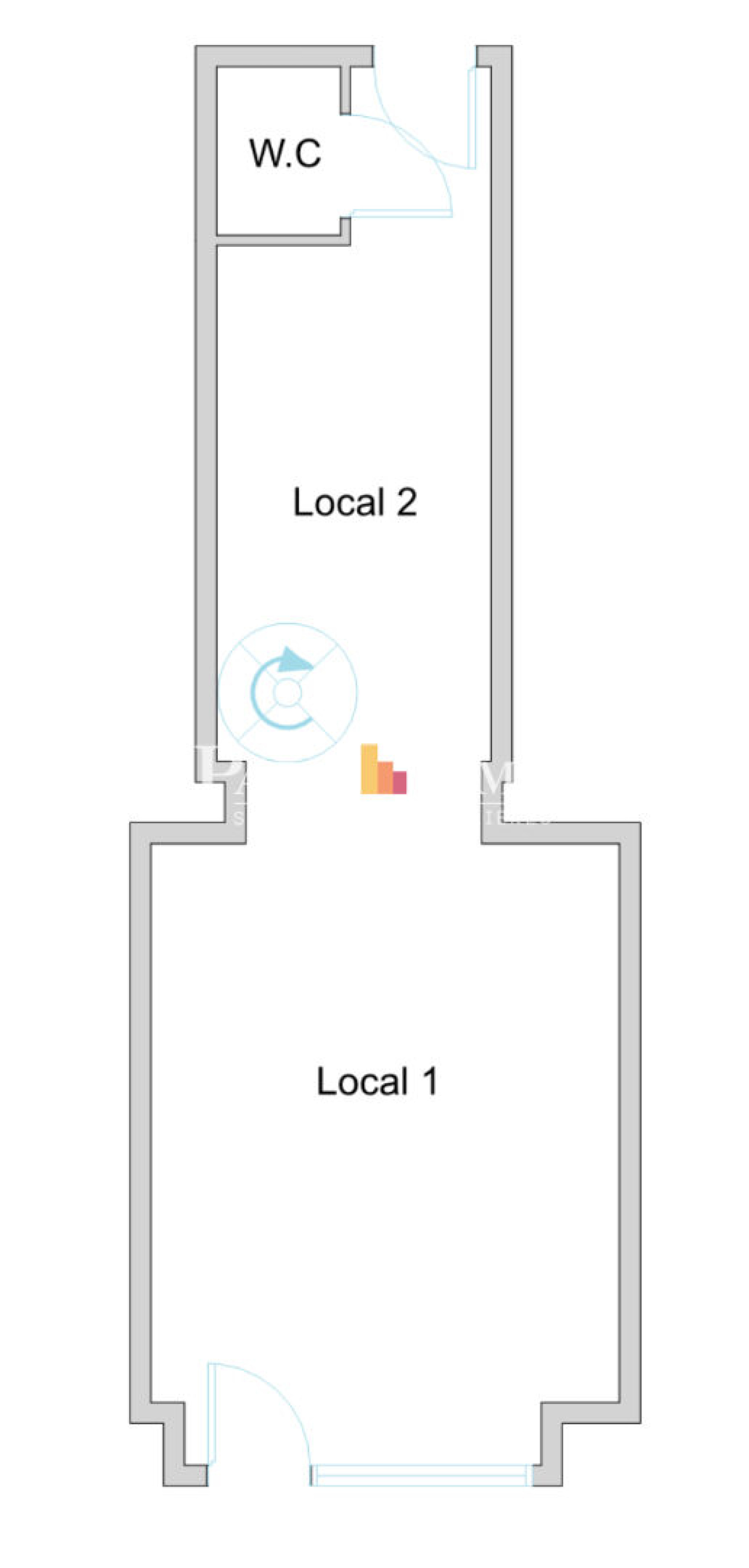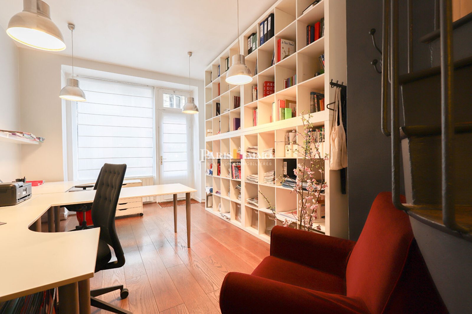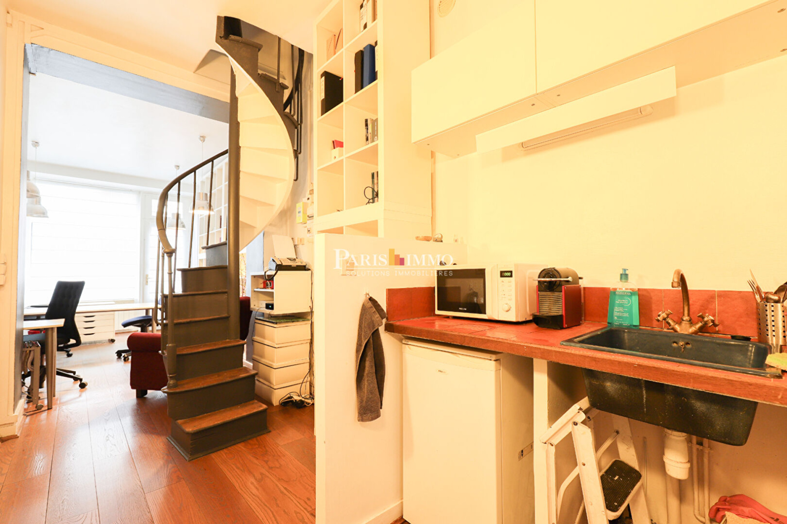 Au rez-de-chaussée 25m2 avec espace bureau dans la première partie, cuisine avec WC séparé coté cour, à l'étage par un escalier en colimaçon, bureaux de 13m2 avec WC séparé, le tout dans un très bon état et dans une copropriété bien entretenue.