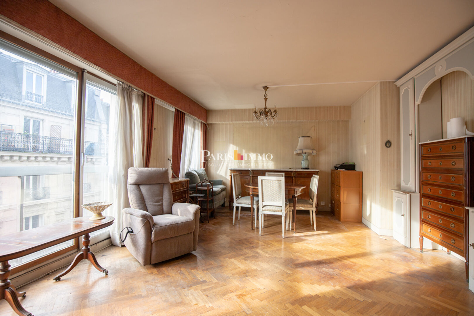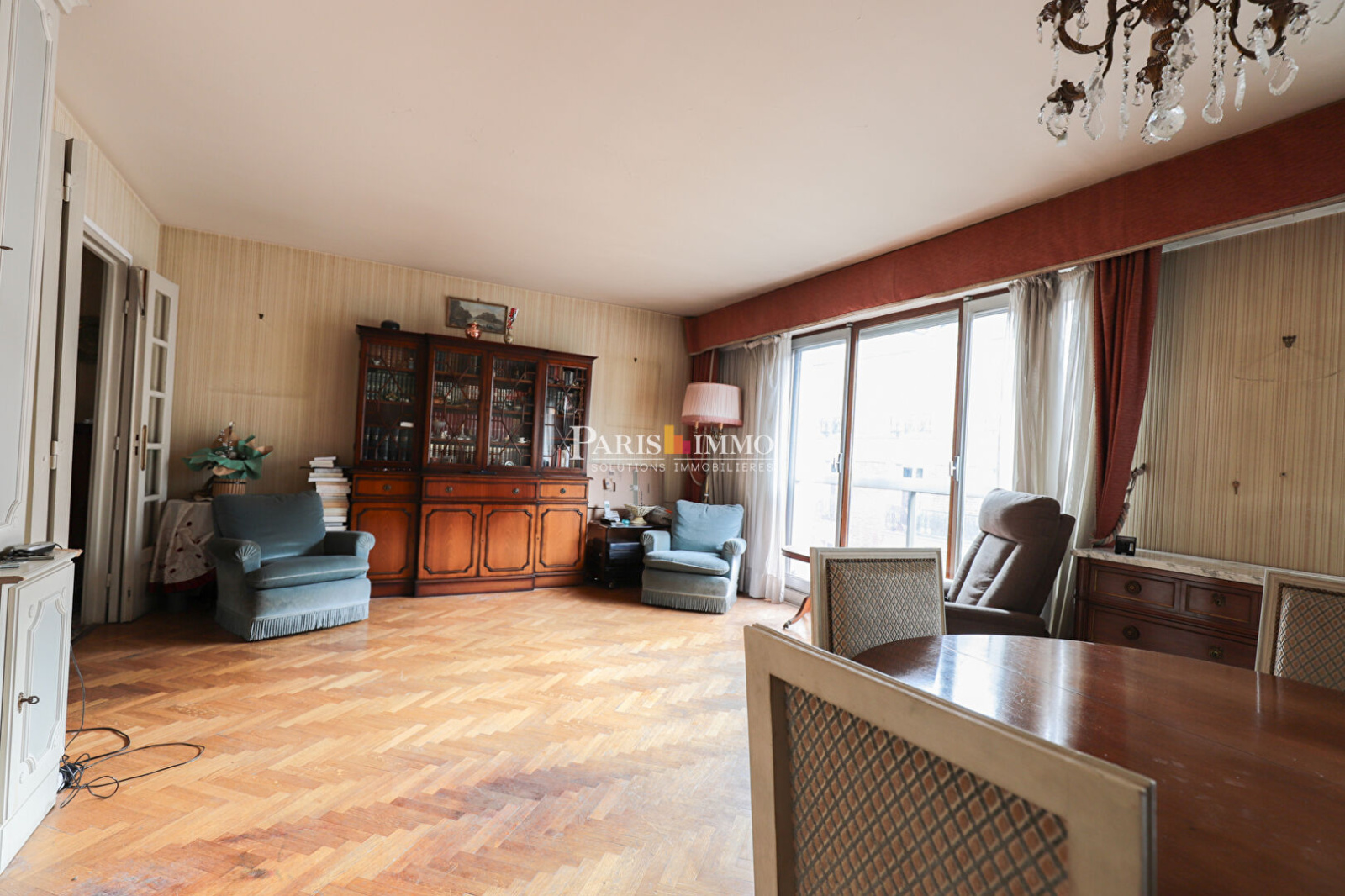 (75018)Grande entrée avec espace de rangements, double séjour avec son parquet point de Hongrie, une chambre, cuisine indépendante, salle de bains , wc séparé, dressing, débarras et une cave.